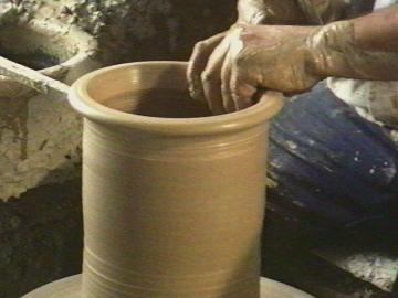 The pots are thrown on wooden bats to simplify the taking off the wheel. The accurate height is determined by a pointing stick.